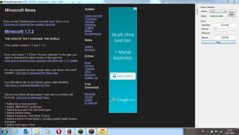 Mit diesem Launcher könnt ihr kostenlos Minecraft 1.7.2 oder andere Versionen spielen. Man kann ständig von Version zu Version wechseln.